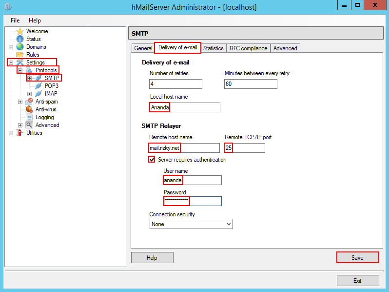 24.) Selanjutnya masuk ke Menu Settings --> Protocols --> SMTP. Pada menu SMTP ini kita pindah ke Tab Delivery of e-mail. Localhost name isikan nama server atau nama lain disini ane isi dengan nama Ananda. Untuk Remote hostname isikan domain mail servernya. Kemudian centang Server requires authentication, isikan username dan password untuk server authentication. Kemudian klik Save.